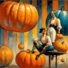 A surreal vintage tableau where fashion and harvest convene in whimsical ceremony. Two elegantly dressed figures—half society portrait, half parody—pose amid radiant gourds, their composure glimmering with irony and affection.