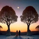 A couple stands embraced under a starry night sky, flanked by silhouetted trees. The horizon glows with hues of orange and purple, illuminated by a soft moonlight.