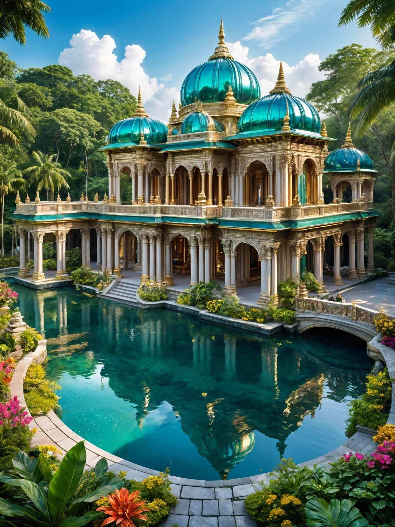 A stunning palace with turquoise domes and intricate gold detailing, surrounded by lush greenery and a serene pool filled with lilies. The architecture reflects a blend of elegance and tranquility.