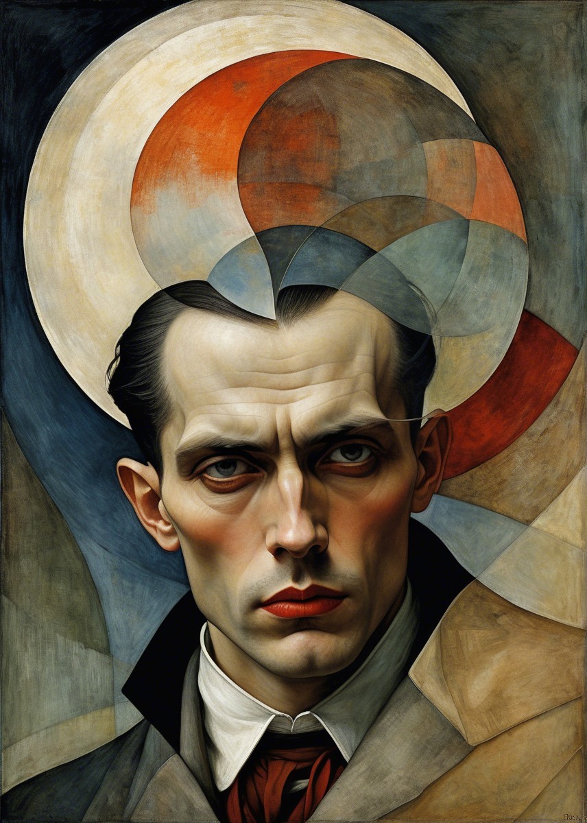 A striking portrait features a man with bright red hair posing against a glowing full moon. He wears a black suit and holds an apple, exuding an air of elegance and mystery.