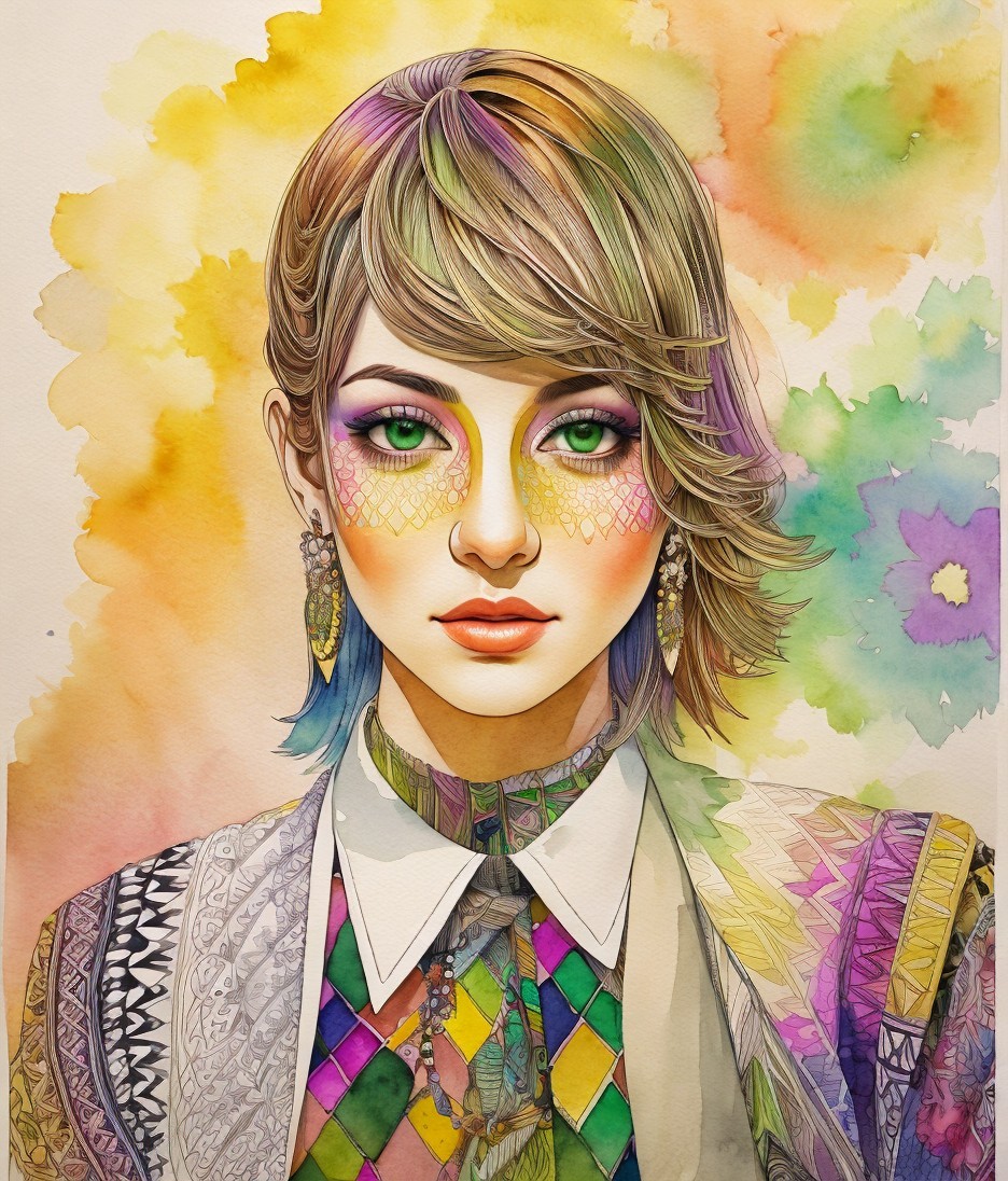 highly detailed, intricate watercolor and ink painting , Geometric , zentangle, op art, triadic color scheme green beige yellow, 3d effects 1.8, shadow mapping 1.3, dynamic lighting 1.7, ambient occlusion 1.5, anisotropic filtering 1.7, raytraced shadows,