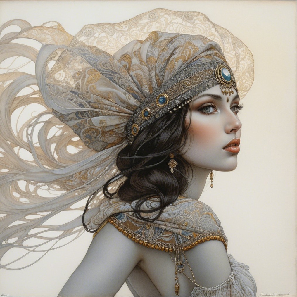 A graceful woman adorned in intricate attire and jewelry gazes serenely into the distance. Her flowing headscarf billows gently, illuminated by a soft sunset in the background.