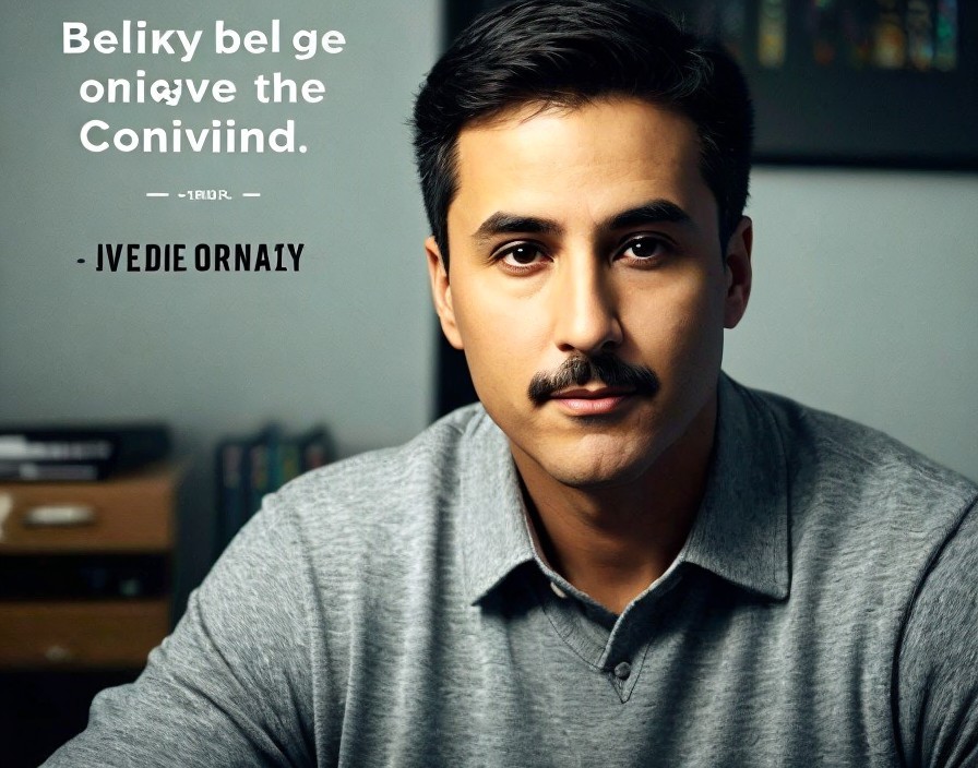 Mustachioed man in gray shirt surrounded by books and text overlays