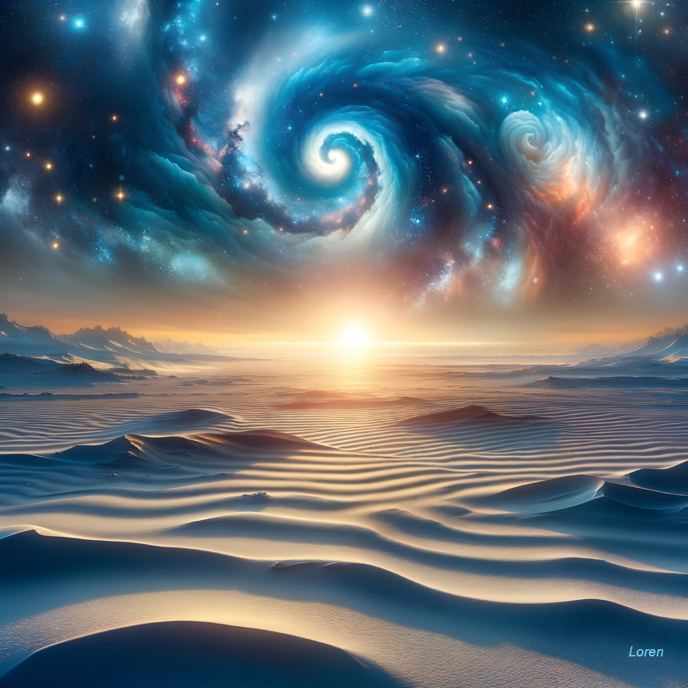 A surreal landscape with a vibrant galaxy swirling above a desert at sunrise, seamlessly blending cosmic and terrestrial vistas.