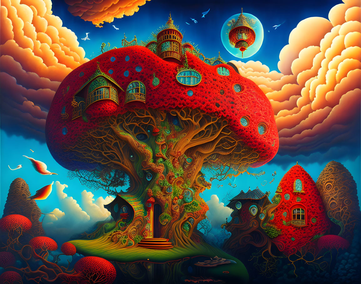 Prompt: treehouse with red highlights, fantastical surrealist otherworldly, vivid colors, ornate, intricate, elegant, surreal, stormy clouds, beautiful high definition acrylic art intricate details, Artist Jacek Yerka, Richard Dennis, ''Beautiful clouds!!!'', Dali