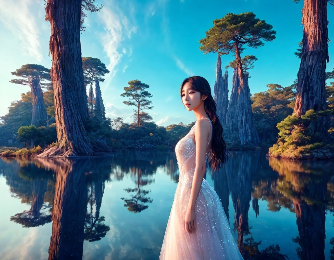 A gorgeous Korean K-Pop star wearing a futuristic dress and standing in front of an otherworldly fantasy world.