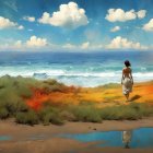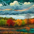 A vibrant landscape showcases swirling clouds above a rich tapestry of fall foliage, featuring fiery reds, warm oranges, and lush greens, reflected in a tranquil waterway below.