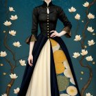 A stylish woman in a bold, patterned dress poses against a vibrant backdrop of geometric shapes and colorful buildings, blending modern elegance with artistic flair.