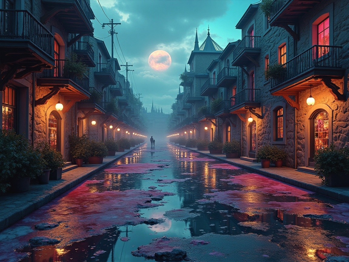 A misty street at twilight, lined with charming buildings, reflects the glowing moon and colorful lights. A solitary figure walks down the empty path, adding to the mysterious ambiance.