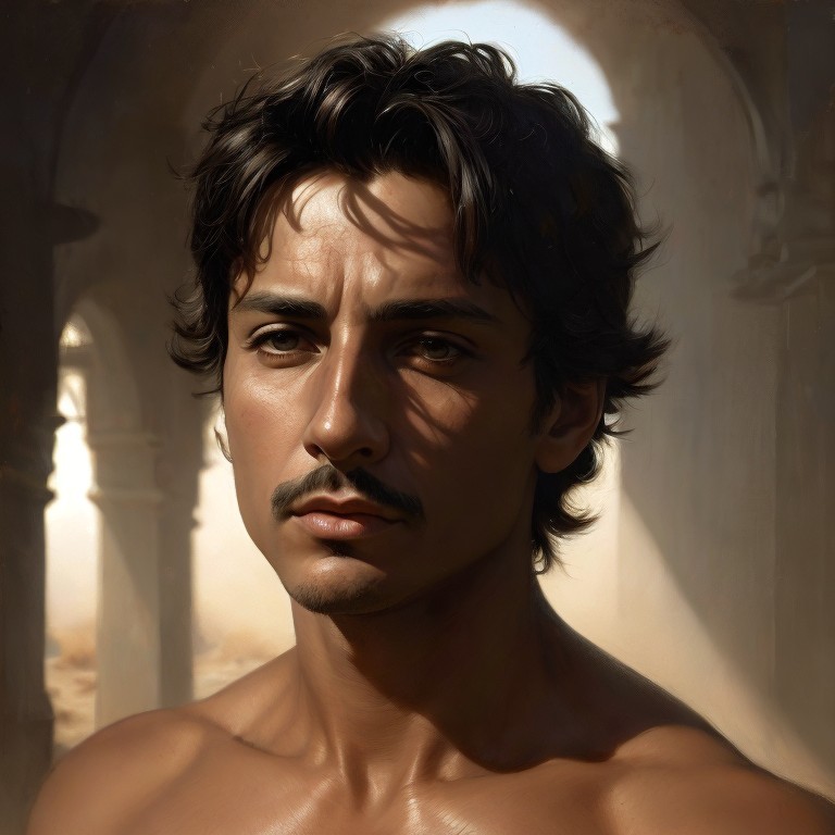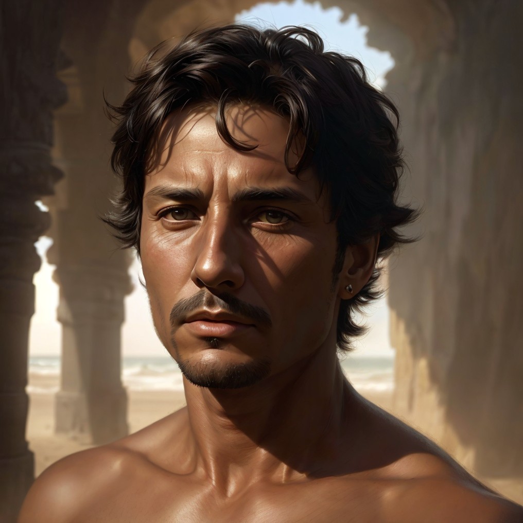 A digital artwork of a man with dark hair, blue eyes, and stubble, set against a beach and archway background.