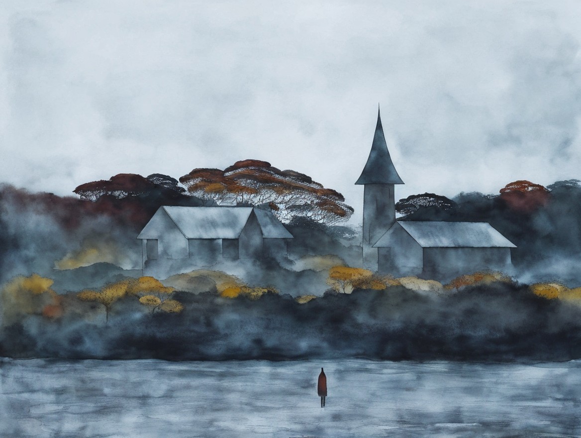 A serene, misty landscape features a group of rustic houses with gray roofs nestled on a hill, surrounded by trees. A tall spire stands distinct as reflections shimmer on the water below.