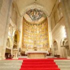 The image showcases the interior of a grand cathedral, featuring tall, ornate columns, colorful stained glass windows, and an intricately designed altar at the front, bathed in soft light.
