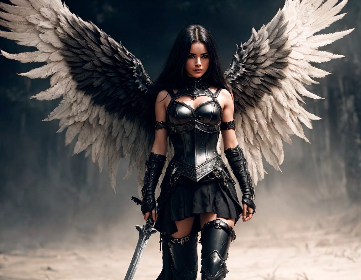 A woman with dark hair and large, white angelic wings wears black armor and wields a sword, set against a misty backdrop.
