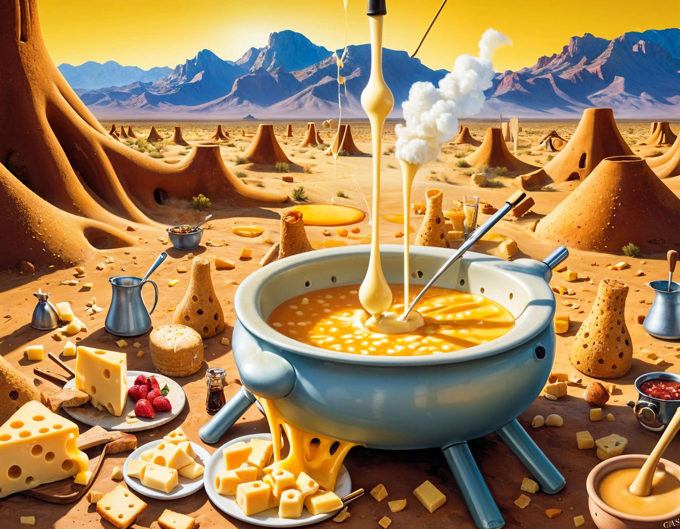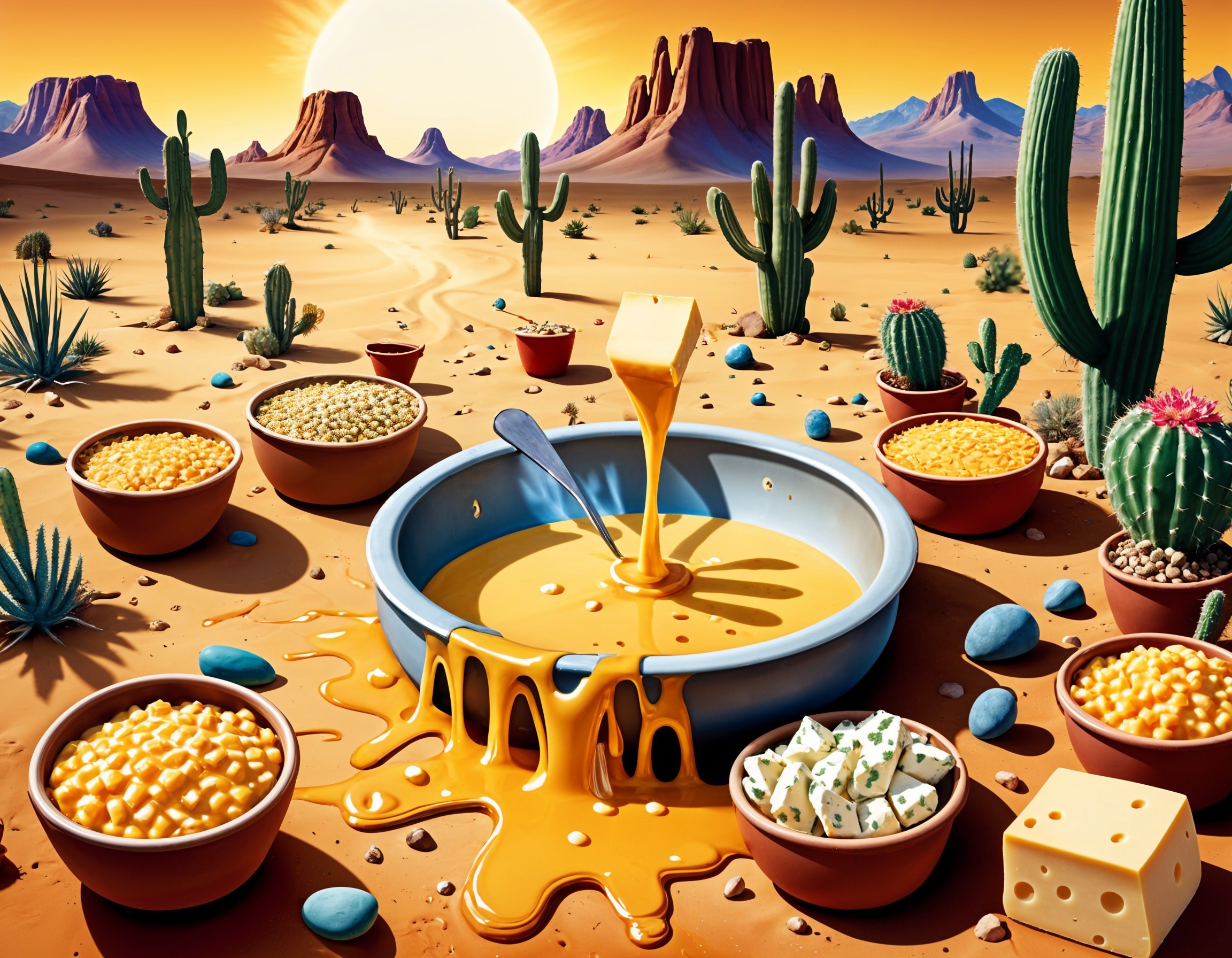 A surreal desert scene features vibrant cacti and mountains at sunset, alongside playful cheese blocks and a bowl of cheesy dip, creating a whimsical fusion of nature and food.