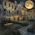 A charming courtyard adorned with glowing jack-o'-lanterns and vibrant autumn foliage, under a large full moon. Cobwebs drape elegantly, creating a cozy, spooky Halloween ambiance.