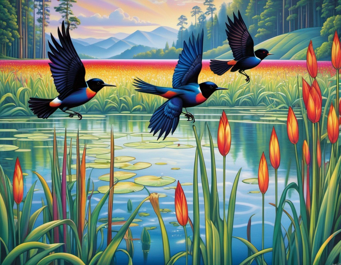 Serene Landscape with Bluebirds Over Tranquil Pond