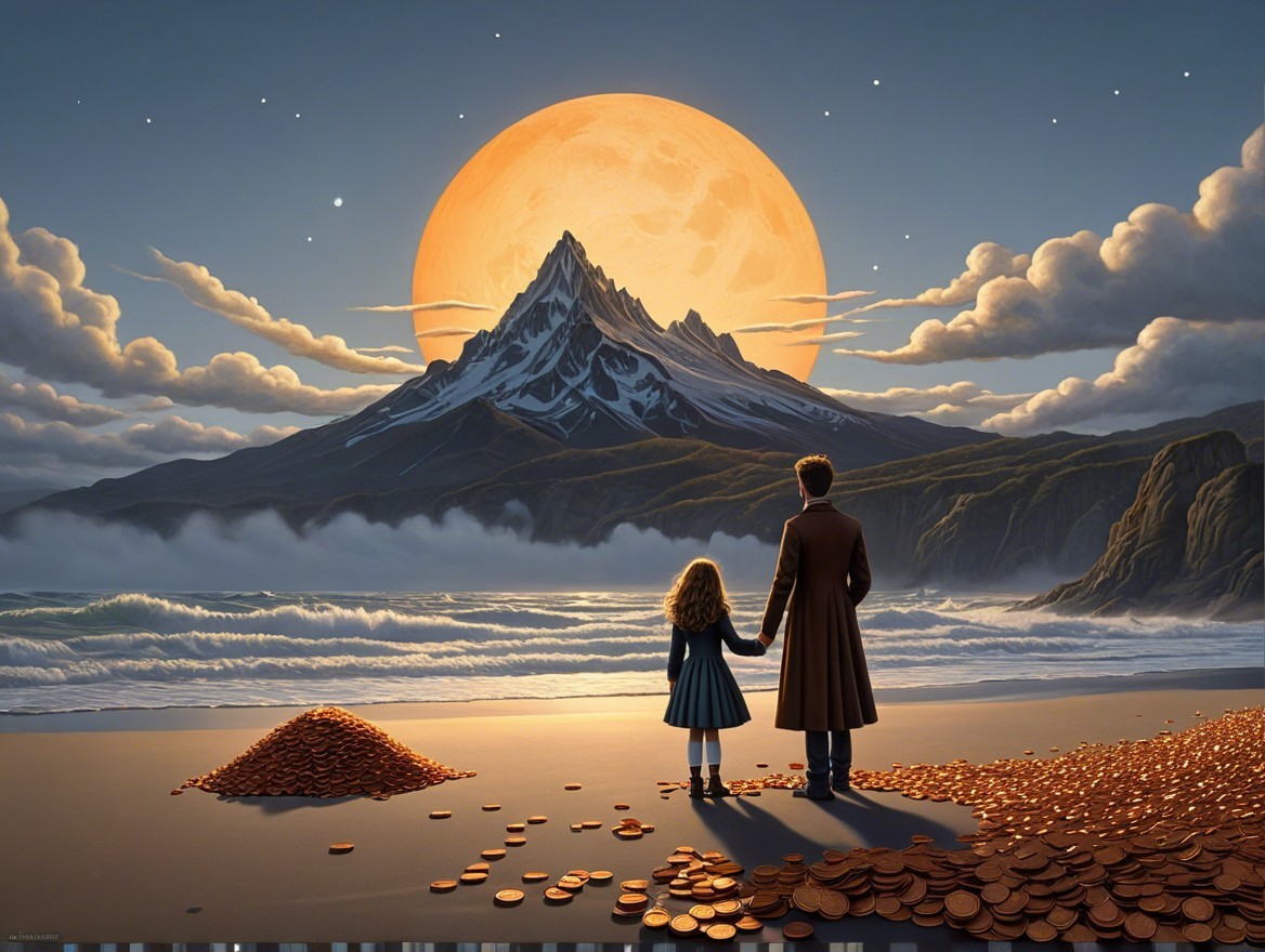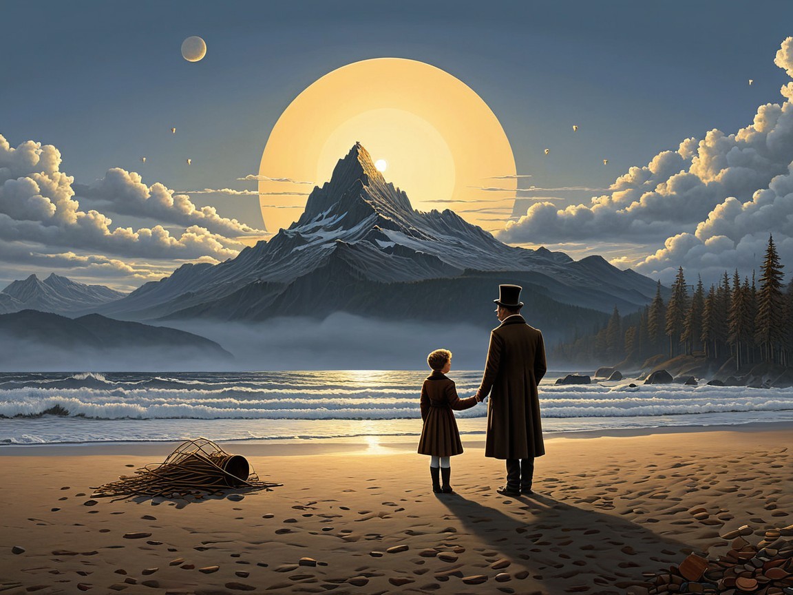 Beach Scene with Sunset, Mountains, and Balloons