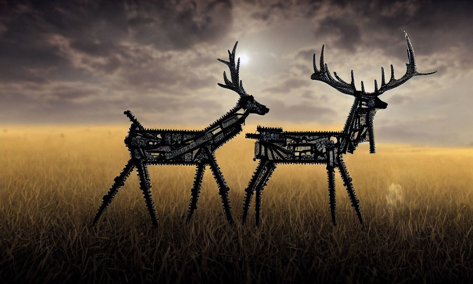 Mechanical deer silhouettes against evening sky with crescent moon