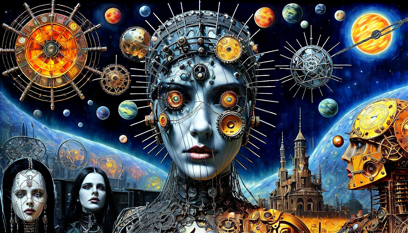 Prompt: Witches of cybernetic beauty, steampunk wire-mesh suits, pipes of hell, hellraiser, pinhead by H.R. Giger, planets in the brain, merged double exposure mixed media, Gustav Klimt and Bill Sienkiewicz, intricate high detail crisp quality cosmic