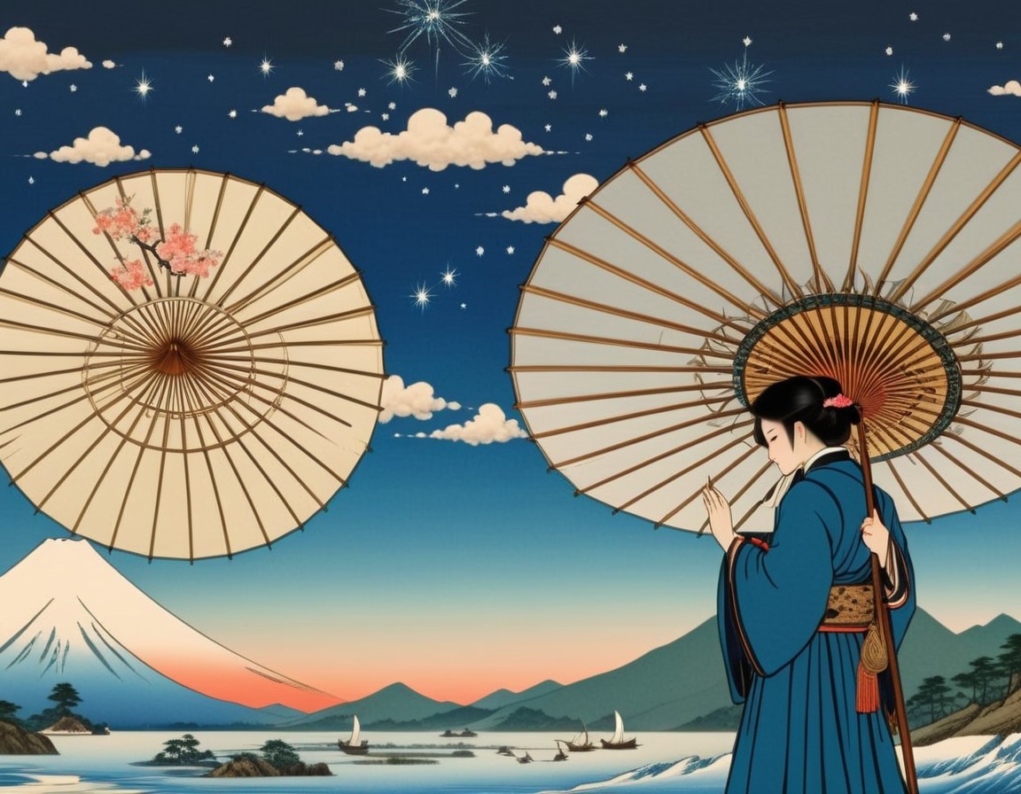An illustrated scene showing a woman holding an oversized piece of cheese on toast, like a telescope, looking at a night sky with a full moon over a coastal town.