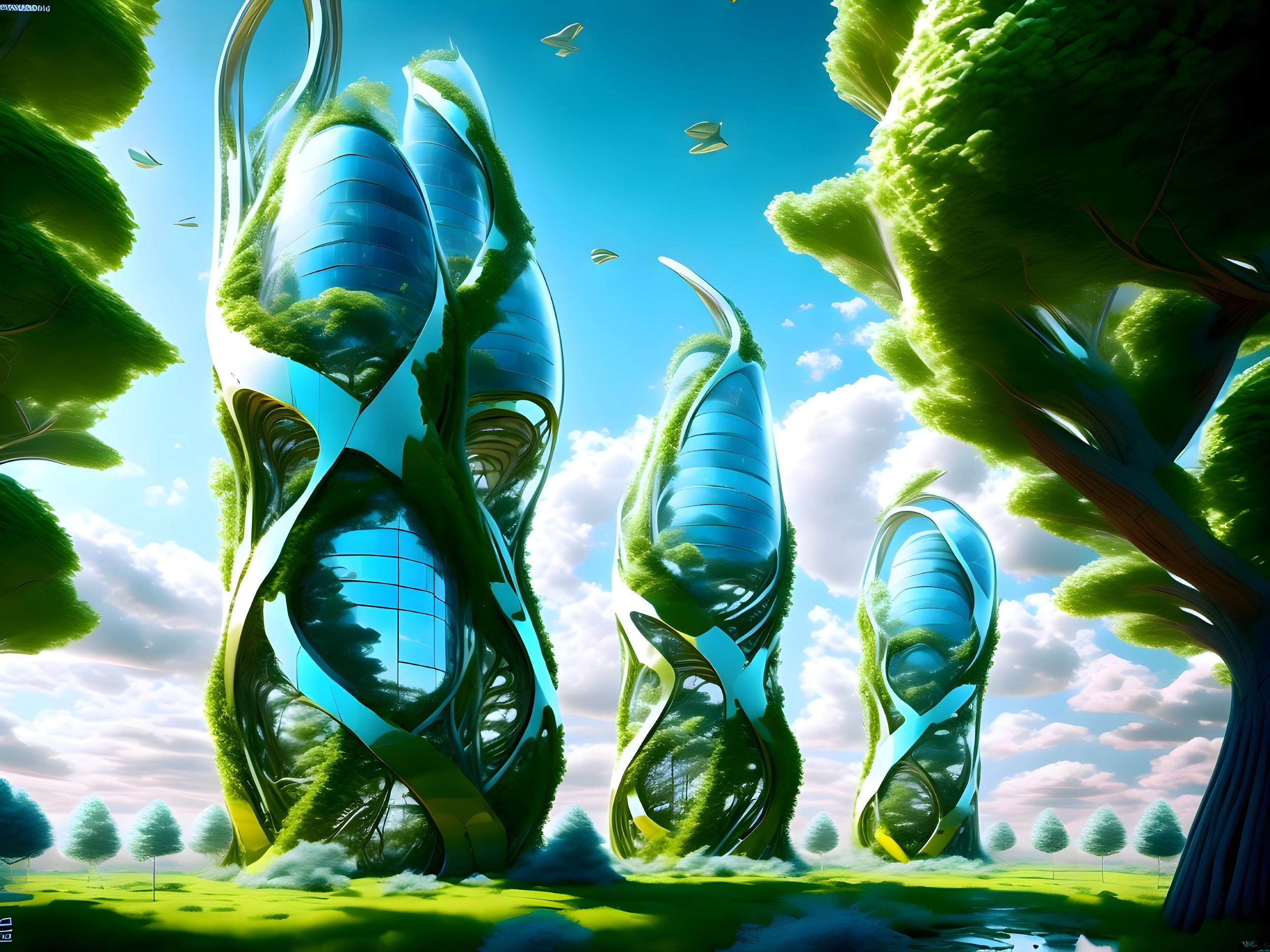 A futuristic cityscape featuring twisting skyscrapers with greenery, set against a bright blue sky and fluffy clouds. The sun rises, casting a golden glow over a lush, landscaped park.