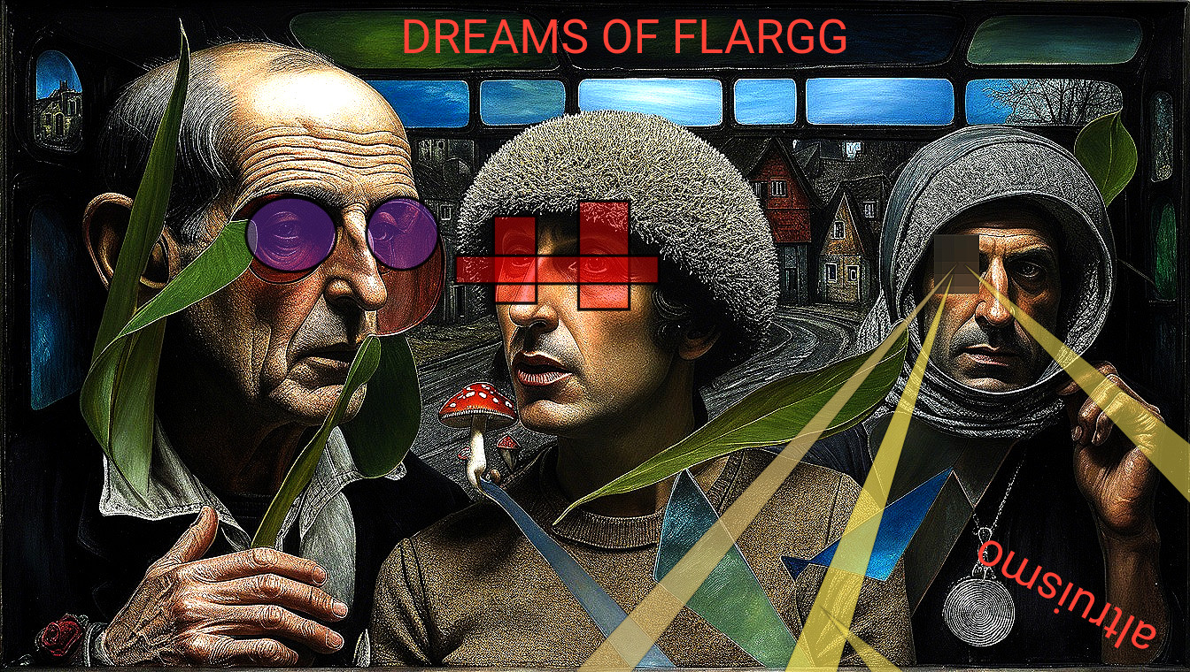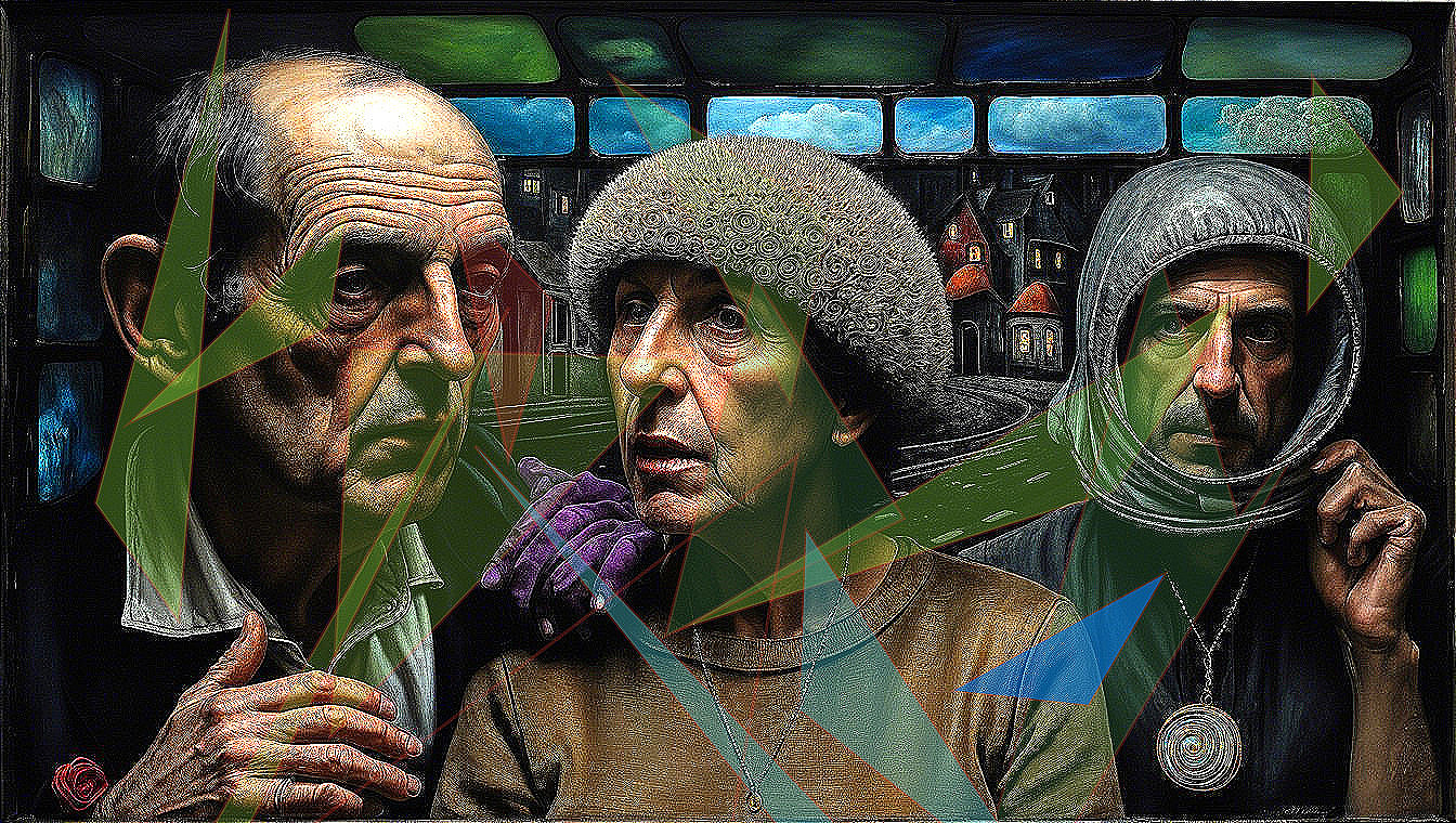 The artwork features three figures with striking geometric shapes and colorful lenses over their faces. The background hints at a dramatic setting, creating a surreal and tension-filled atmosphere.