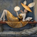 A serene woman in an elegant orange dress lounges on a bench, adorned with flowers and greenery. She wears a wide-brimmed hat, exuding grace and tranquility in a beautifully decorative setting.