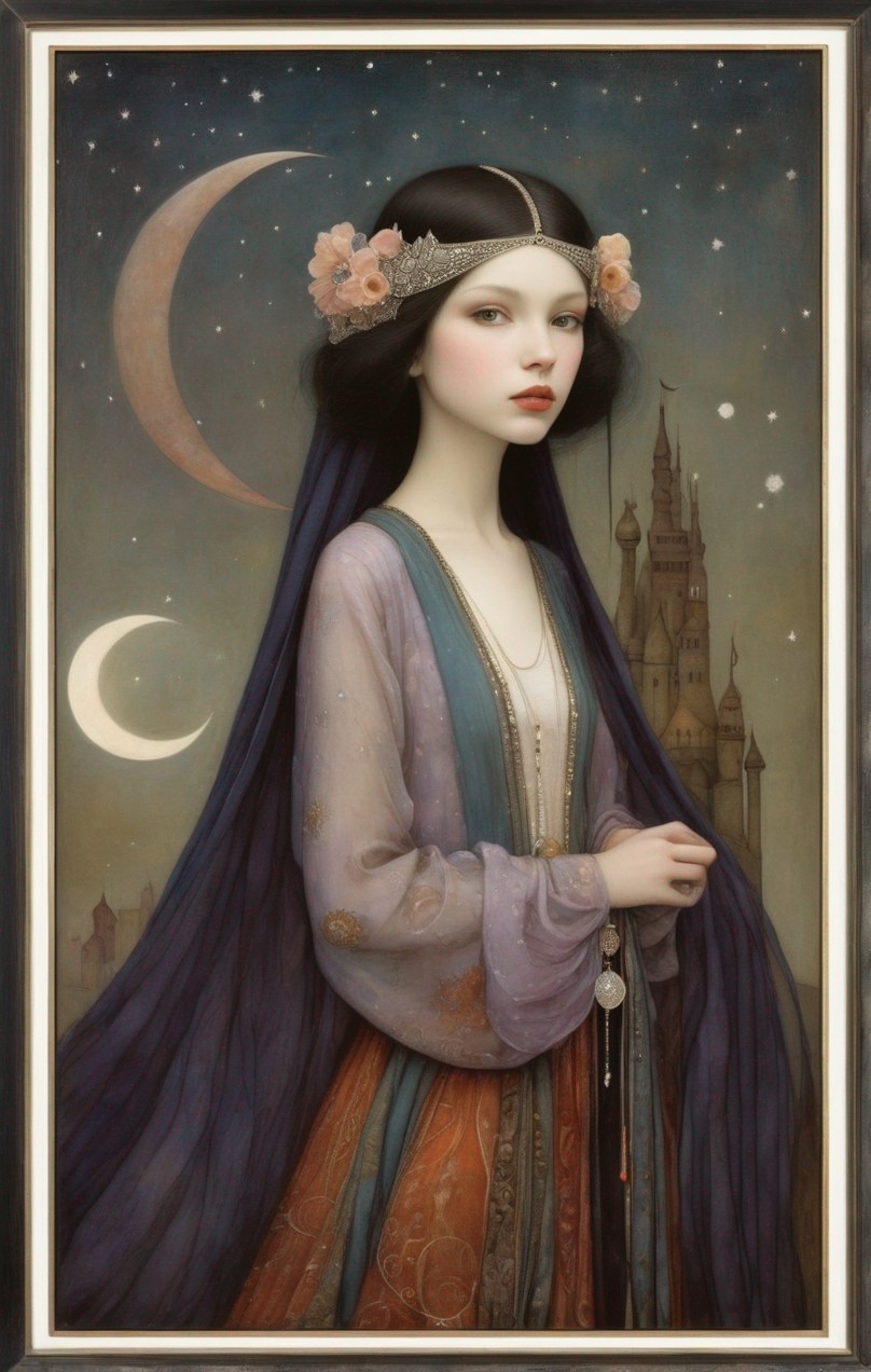 Illustrated portrait of a woman in medieval eastern attire with floating lanterns and stars.