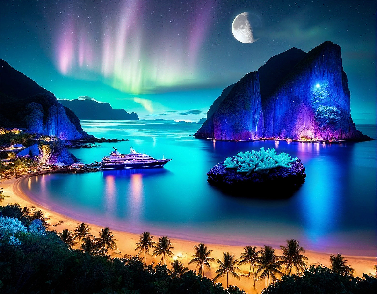 A seaside town surrounded by mountain ranges in the bay illuminated by the aurora borealis, cruise ships next to the bioluminescent coral reef, a cruise ship is moored at the pier, coconut palms are beautifully planted along the coast
