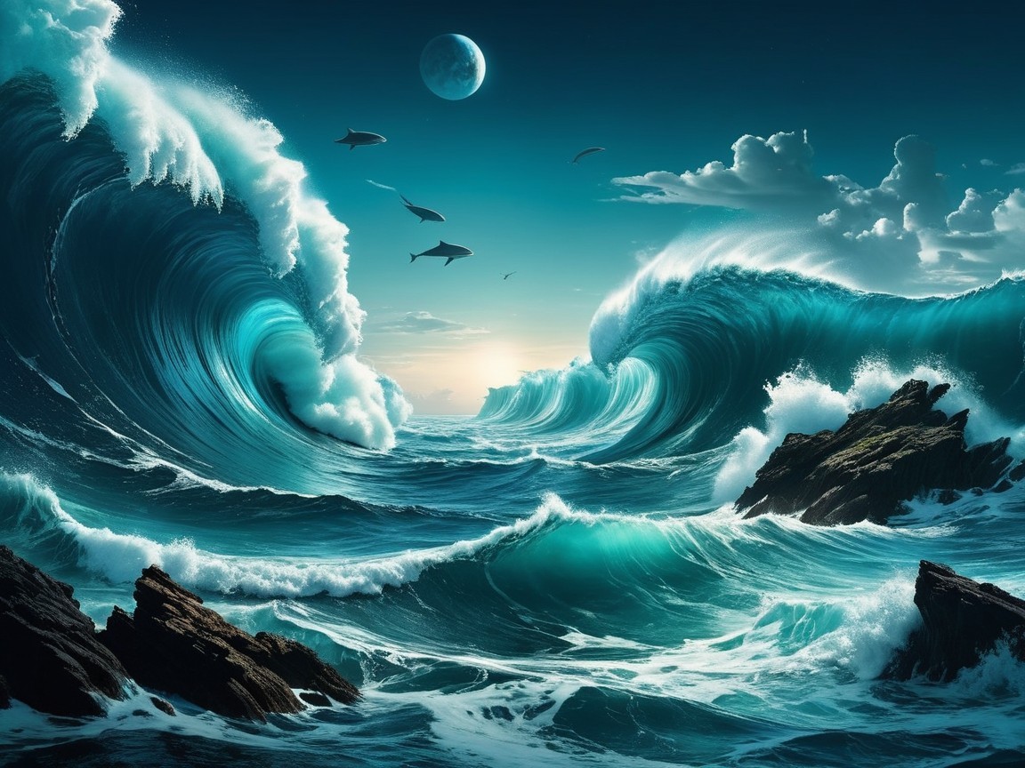 A stunning ocean scene features towering waves crashing against dark rocky cliffs, illuminated by a serene moon. Dolphins leap through the water, while clouds drift in a tranquil sky.