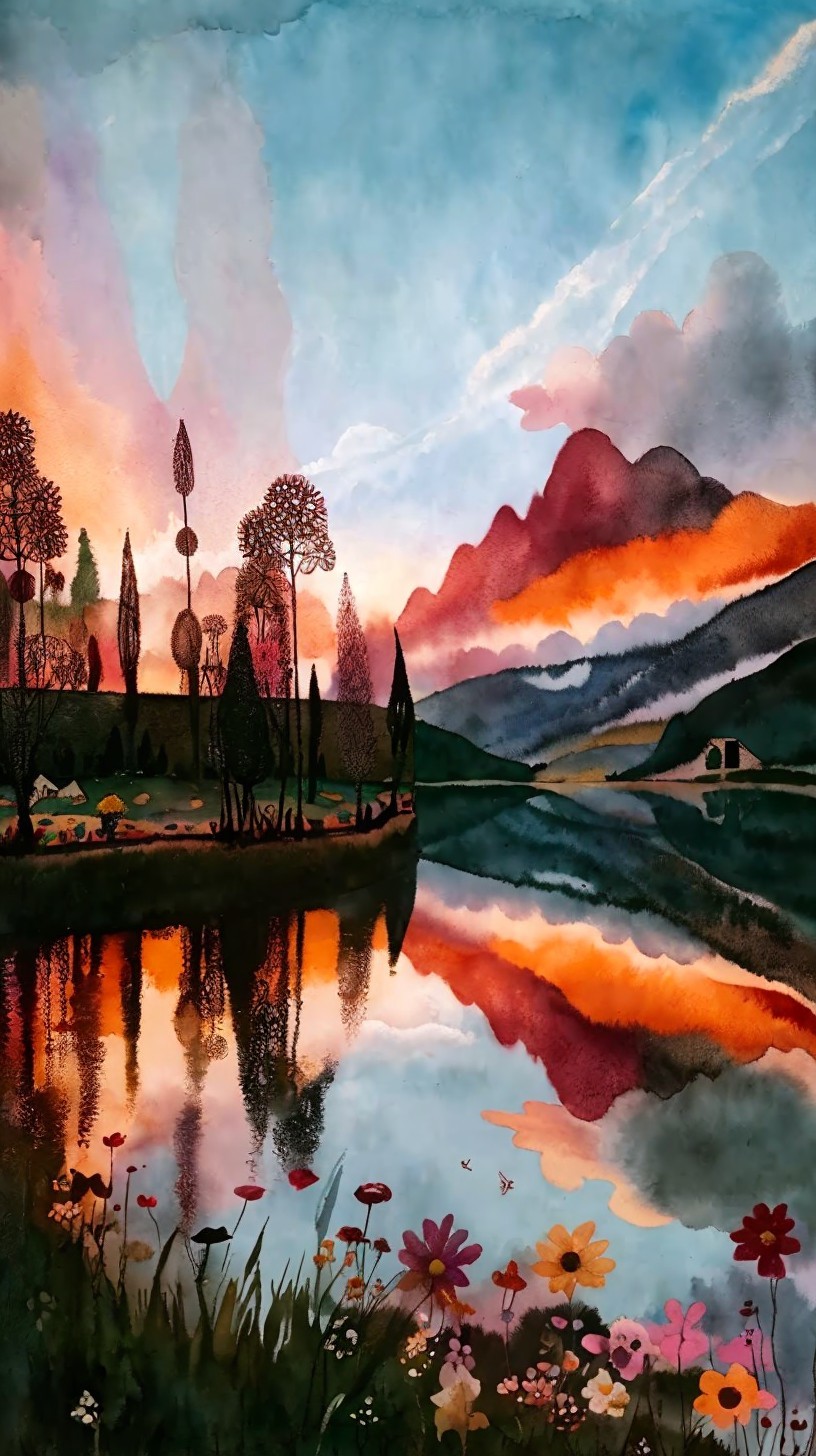 A colorful watercolor landscape with a sunset, clouds, and a reflective river surrounded by flowers and trees.