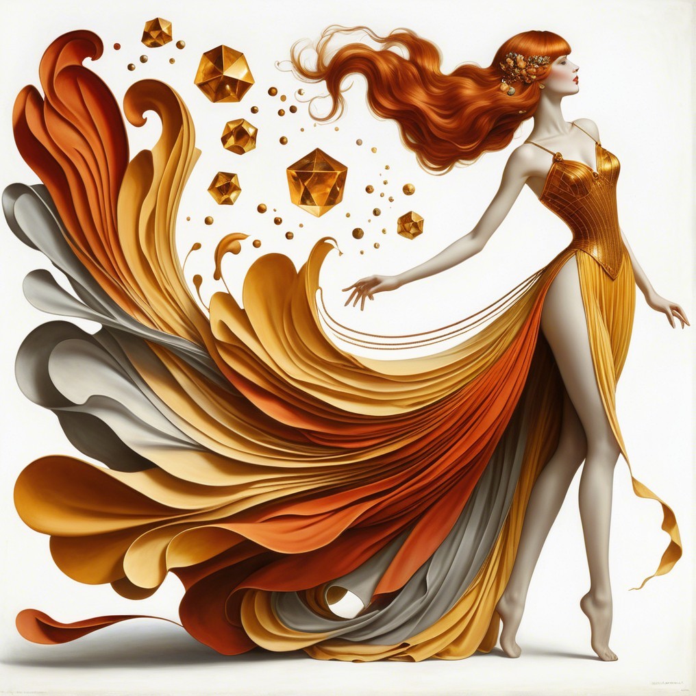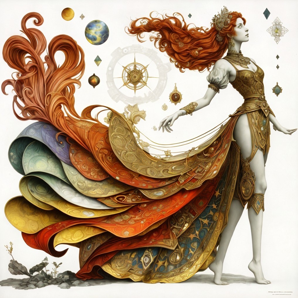 A striking woman in an elaborate, flowing gown adorned with celestial motifs. Her hair billows around her, and the background features an ornate blend of architecture and cosmic elements.