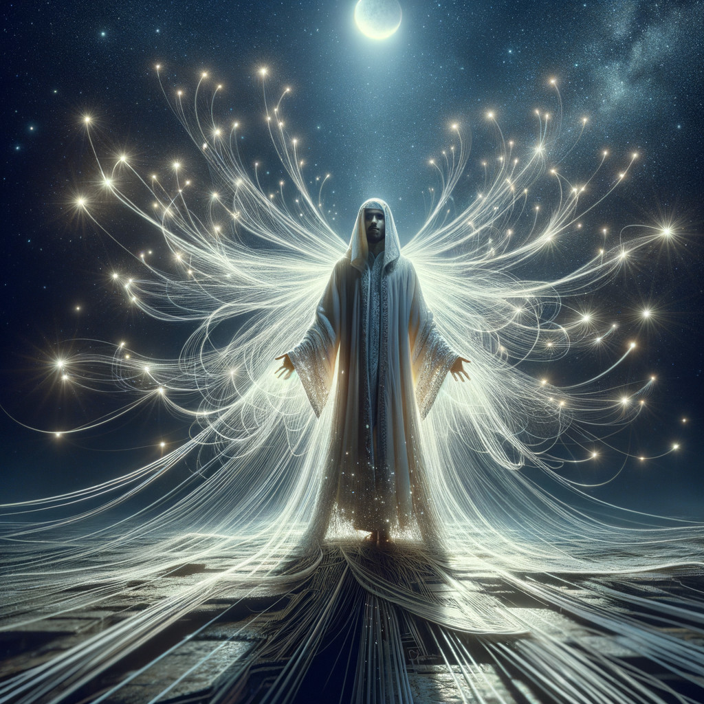 Prompt: "An amazing shape of a man in a long white robe completely and entirely made of tightly woven thin strands of glowing light. dark night scene, lots of stars visible but no moon elegant extremely detailed fantasy beautiful wallpaper high definition watercolor magical mystical Surrealism"