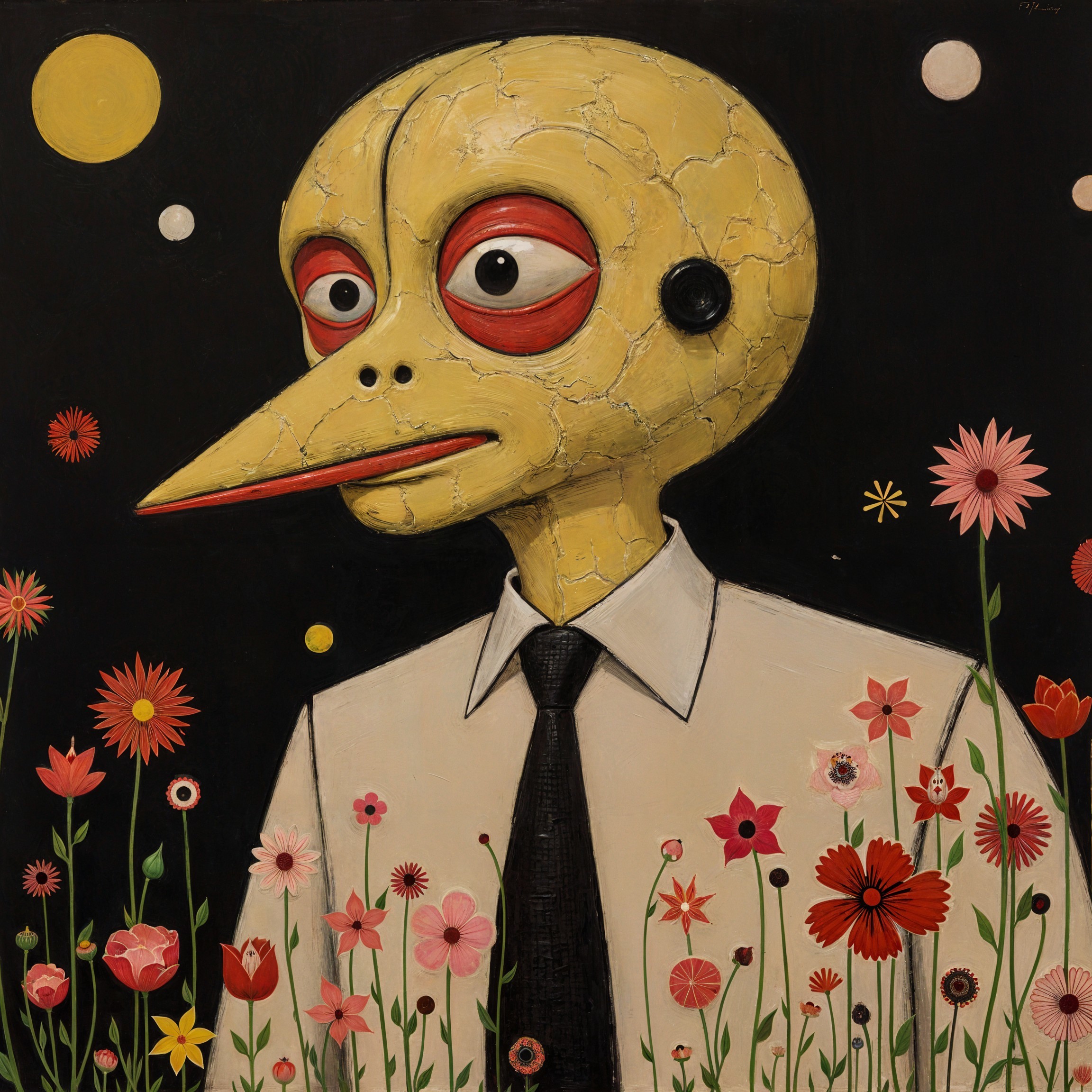 The image features a colorful art piece titled "Shadow Work," illustrating elegant figures in various settings, blending themes of work and social interaction in a stylized, vintage style.