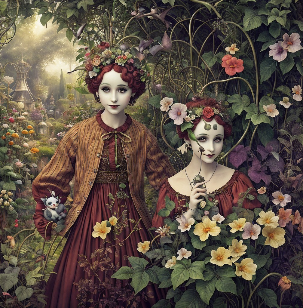 Close up, impish devious Pierrot creature in a garden jungle maze, in the style of Alexander Jansson. by Catrin Welz-Stein, Michael Parkes