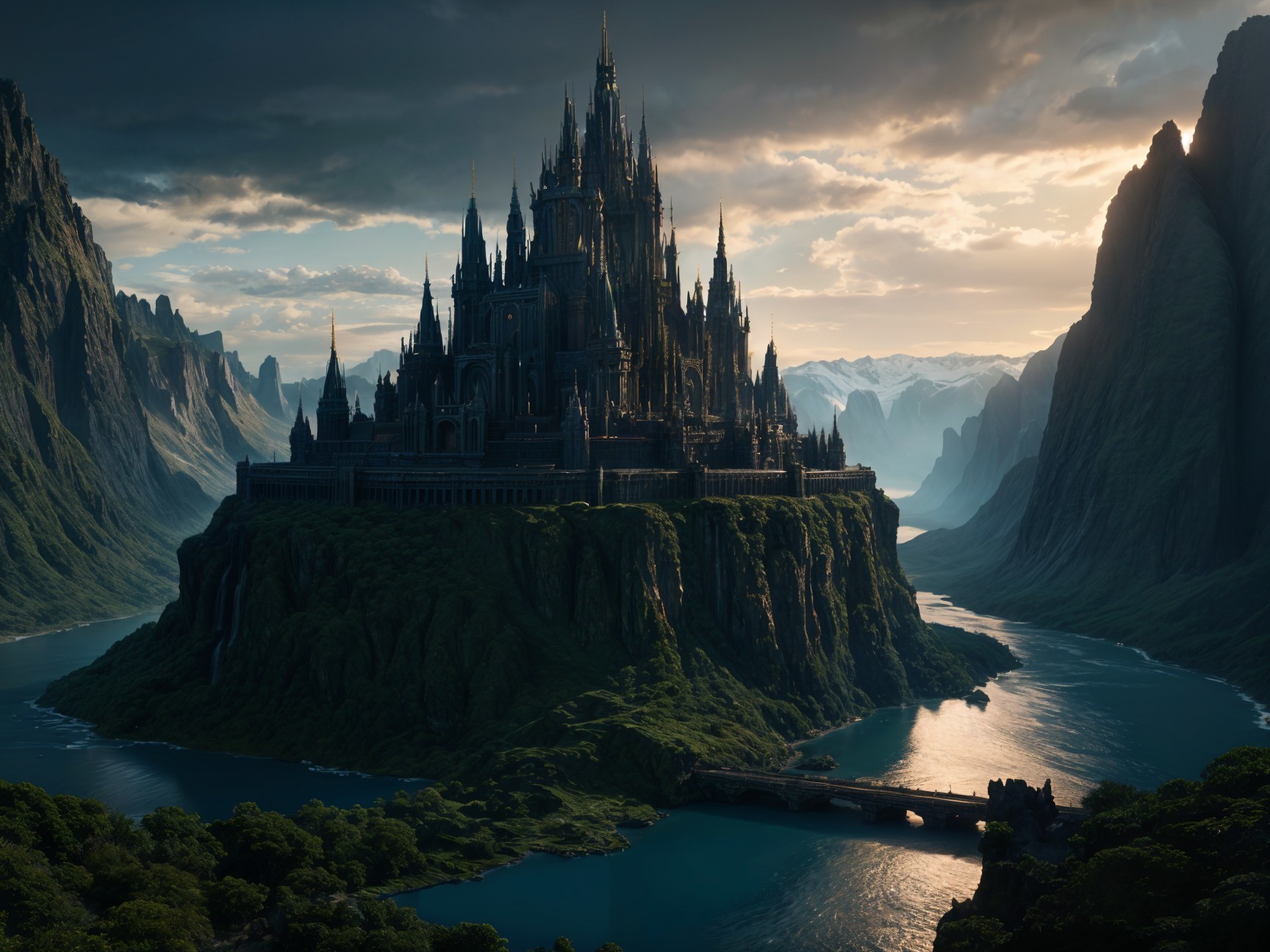 A majestic, ancient castle sits atop a hill, surrounded by towering mountains and a shimmering lake. The sky is painted with dramatic clouds, casting a mystical glow over the enchanting landscape.