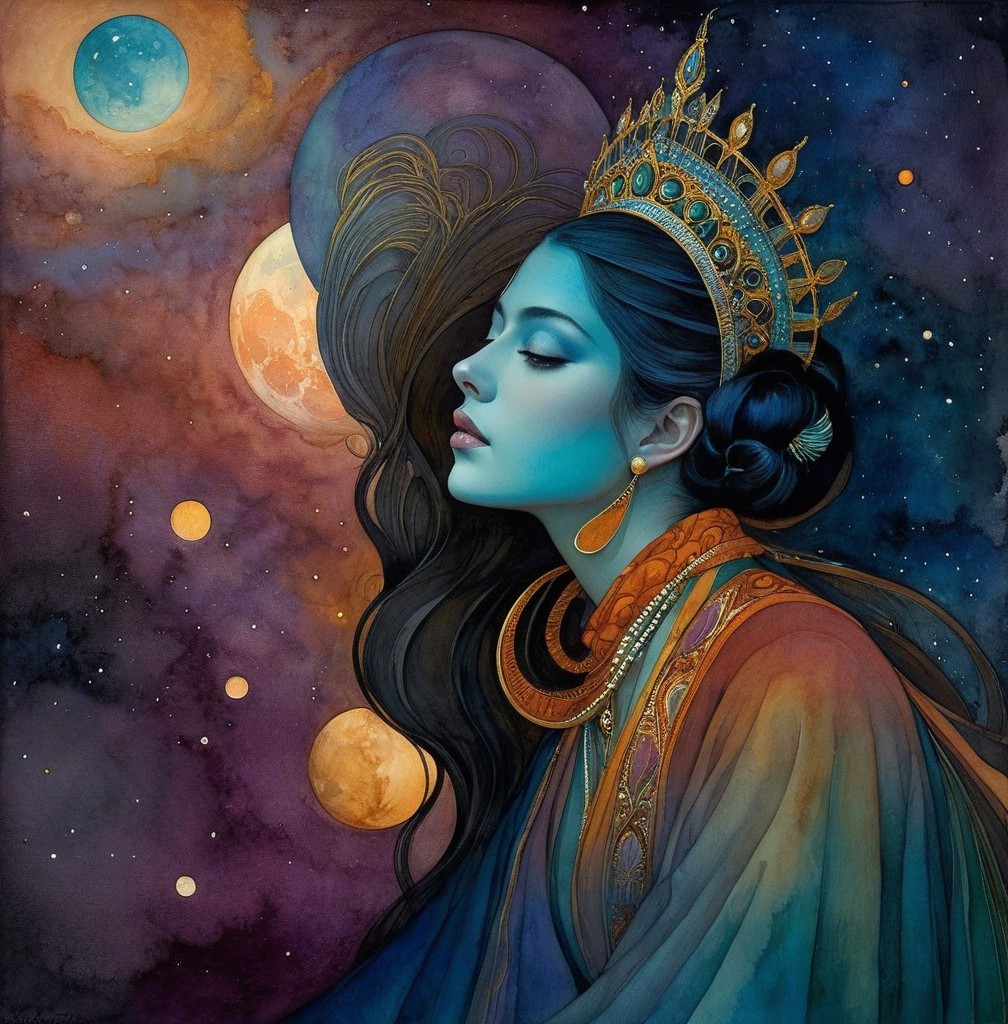 A serene female figure with long dark hair and intricate jewelry gazes thoughtfully, framed by a mystical landscape. The night sky features two moons, casting a magical glow over the scene.