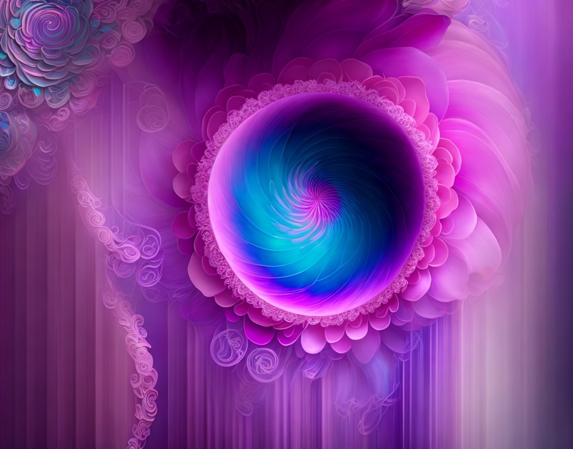 A vibrant digital artwork featuring a spiraling tunnel of layered, petal-like patterns in shades of pink, purple, and blue.