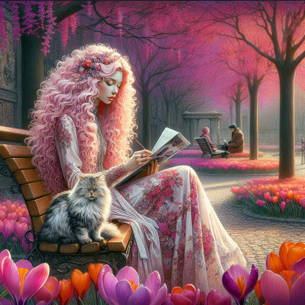 Prompt: "((Masterpiece)), ((Create a stunning picture of Full body portrait)), (((Elegant woman, Long curly pink hair, reading magazine, bench, scruffy cat, magical park, pink crocuses, peaceful atmosphere, alcohol ink, pen and ink, illustration, watercolor, whimsical style, vibrant colors, detailed floral elements, dreamy setting, soft lighting, enchanting ambiance))), Use stunning Chinese watercolor painting and pencil sketch, As if created by By Arthur Rackham, Ernst Haeckel."