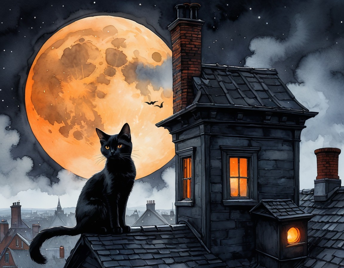 A black cat perches on a rooftop, silhouetted against a glowing full moon. The night sky is filled with clouds, and warm light spills from the windows of nearby houses, creating a cozy atmosphere.