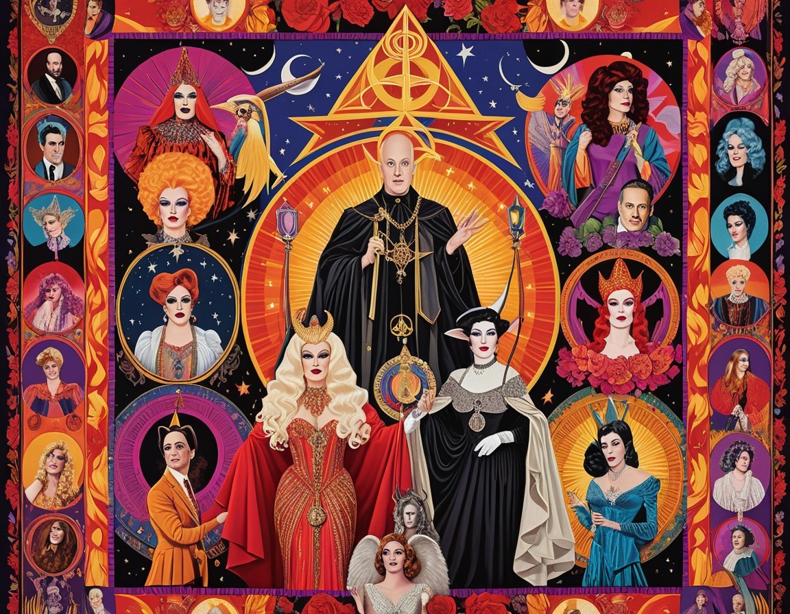 A vivid illustration featuring an array of stylized characters with fantastical and mystical themes, including celestial symbols and cosmic imagery.