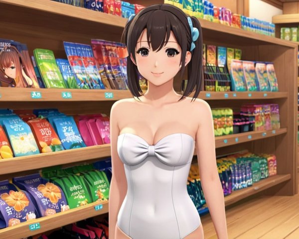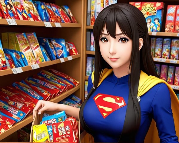 A charming character in a whimsical intergalactic nightgown, adorned with stars and planets. Her playful design radiates a sense of wonder and adventure, perfect for a dreamy cosmic setting.