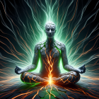 A humanoid figure sits in a meditative pose, with a fractal-like skin pattern. Vibrant energy lines radiate from the figure, creating a dynamic, colorful aura in a dark background.