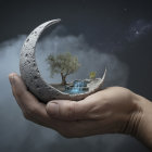 A large, textured hand cradles a crescent moon featuring a miniature landscape with a tree, waterfall, and rocks, symbolizing harmony between nature and the cosmos.