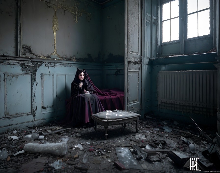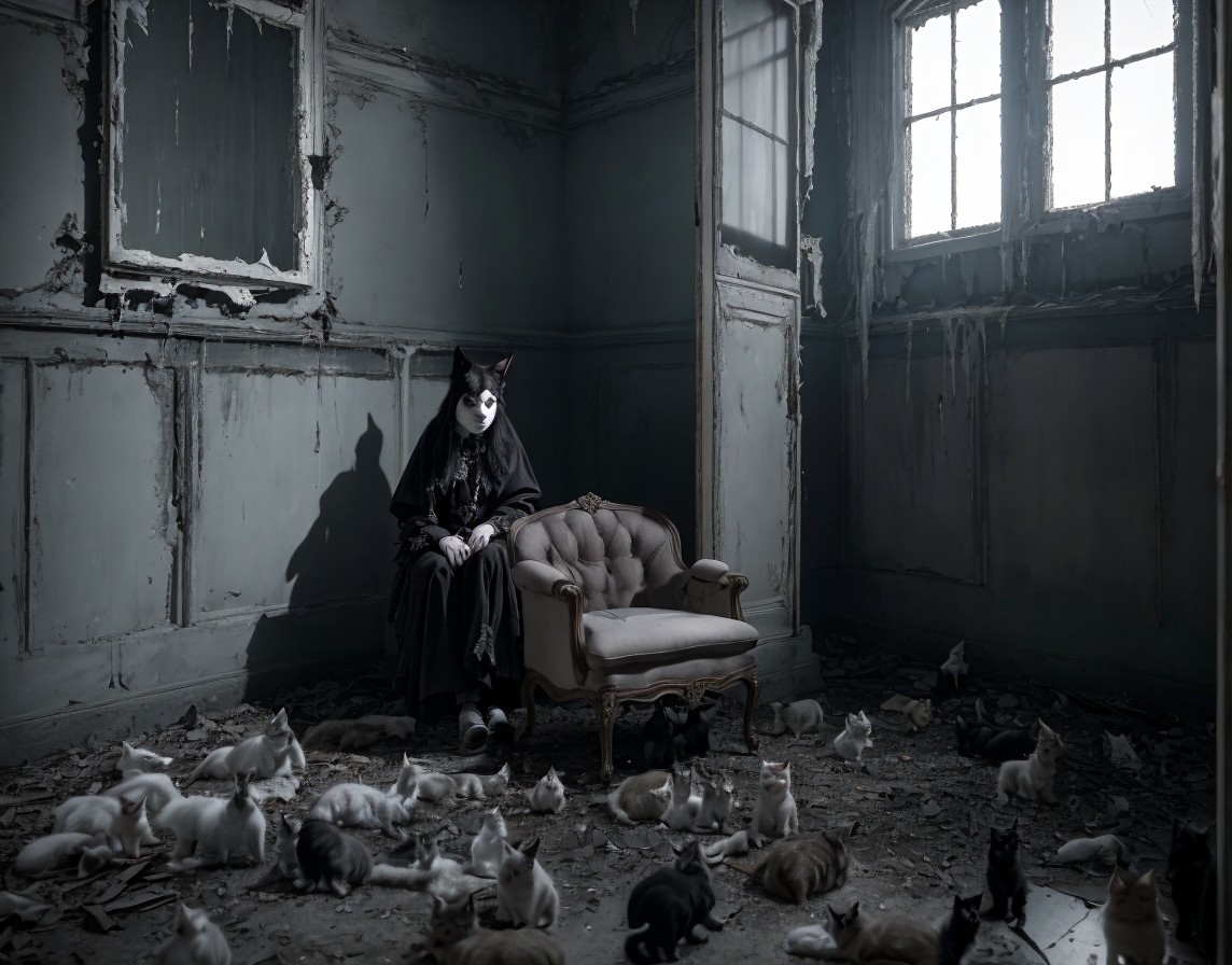 very strong visual expression of extreme insane happiness and suffering from hallucinations by photographer Borut Peterlin cats drama Extremely detailed cinematic film still photography Insanely Detailed 4K, Hyperrealism In an abandoned asylum, filled with dark shadows, a mysterious ghostly figure in front of an illuminated window with cracked glass. The dim light creates an unsettling interplay of light and dark areas.