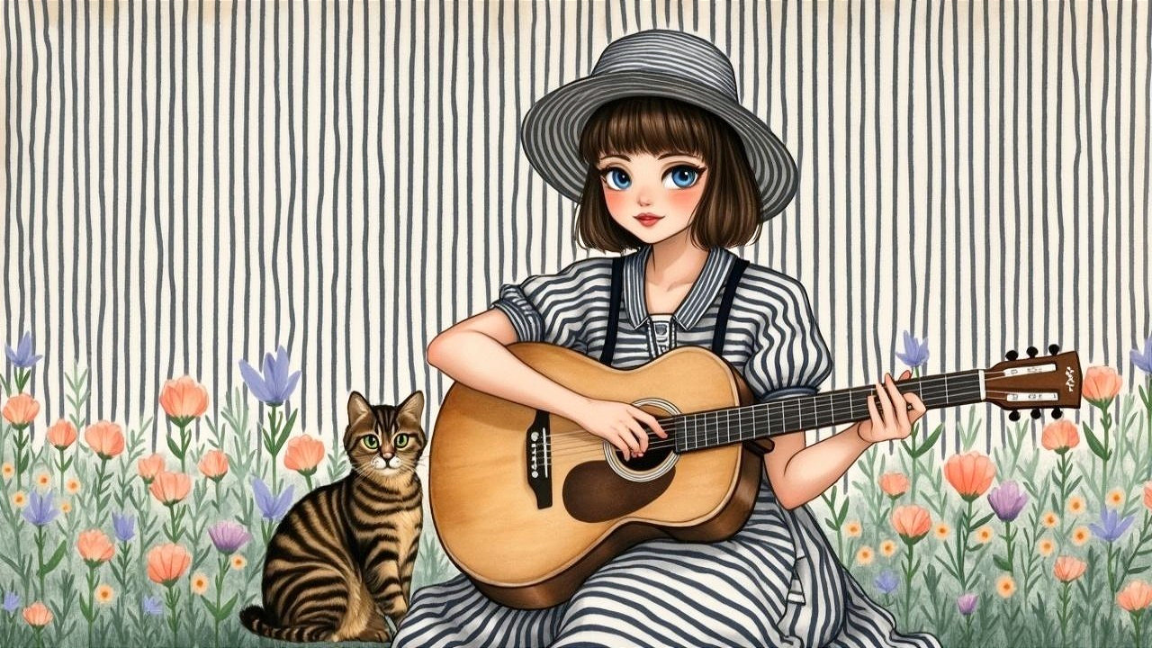 (Try from LoveCat) - A young girl with a bob hairstyle, wearing a striped dress and hat, plays guitar beside a tabby cat. She is surrounded by colorful flowers against a striped background.