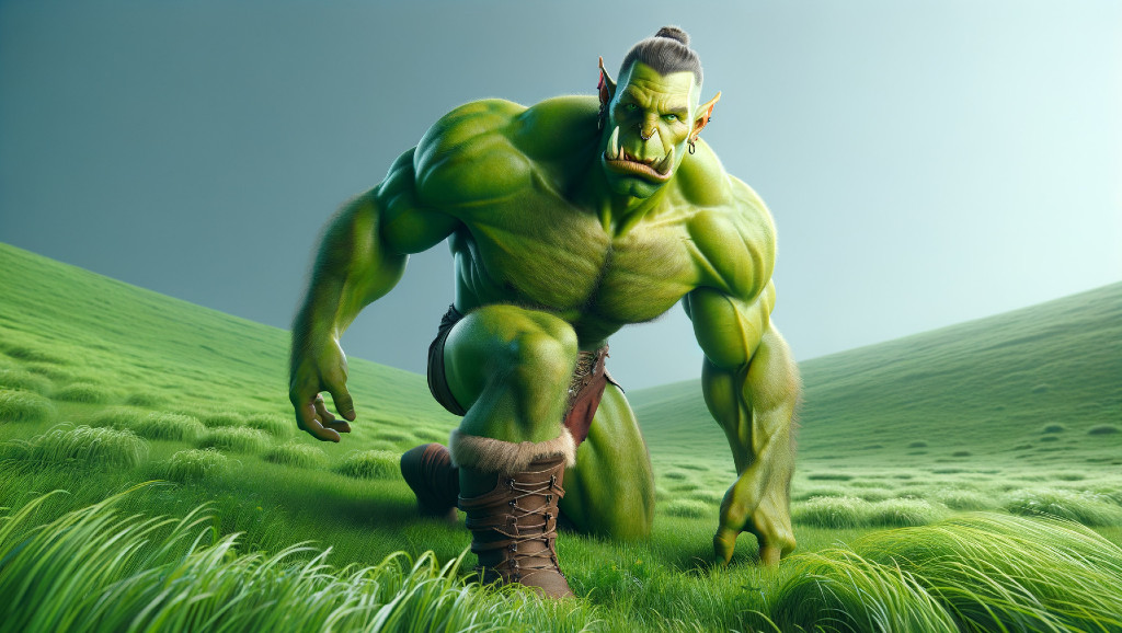 Prompt: On a grassfield, a tall lean handsome good looking orc with high cheek bones and wiry athletic figure and apple green skin and two very small tusks, wearing only boots and speedos. He is slightly crouched and facing the viewer, posing as a wrestler preparing to wrestle.