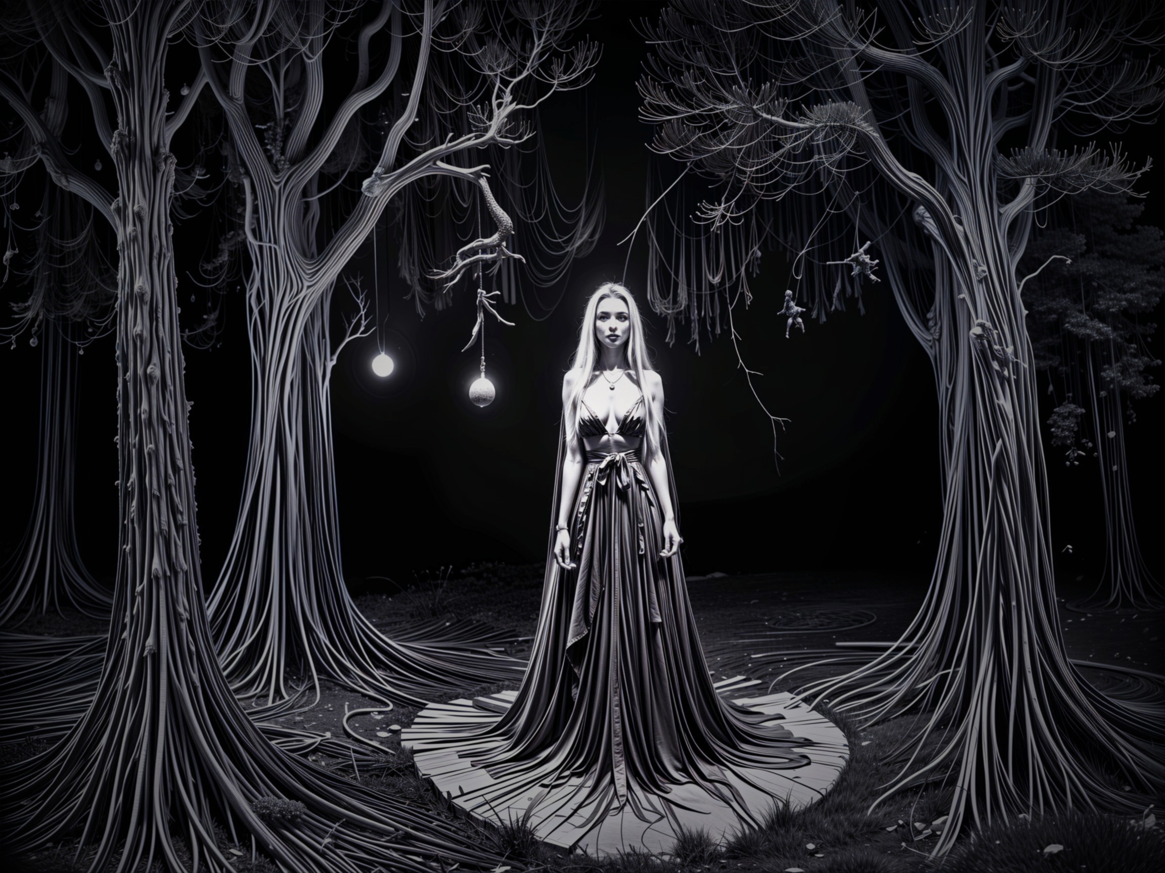 A hauntingly beautiful scene features a skeleton in a long, flowing dress, standing in a shadowy forest. Two moons illuminate the dark trees, creating a spooky yet enchanting atmosphere.
