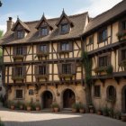 A picturesque street featuring charming, timber-framed buildings adorned with flower boxes. The warm glow of lights invites visitors to cosy pubs and cafes, enhancing the quaint village atmosphere.