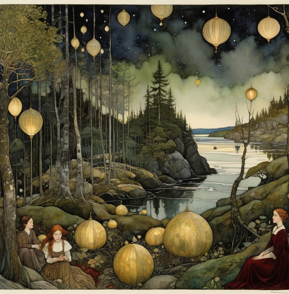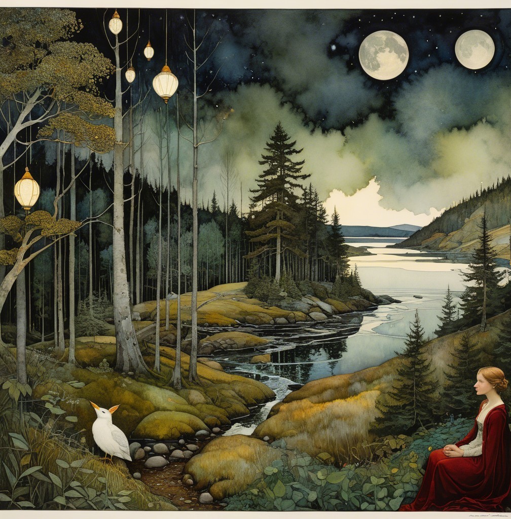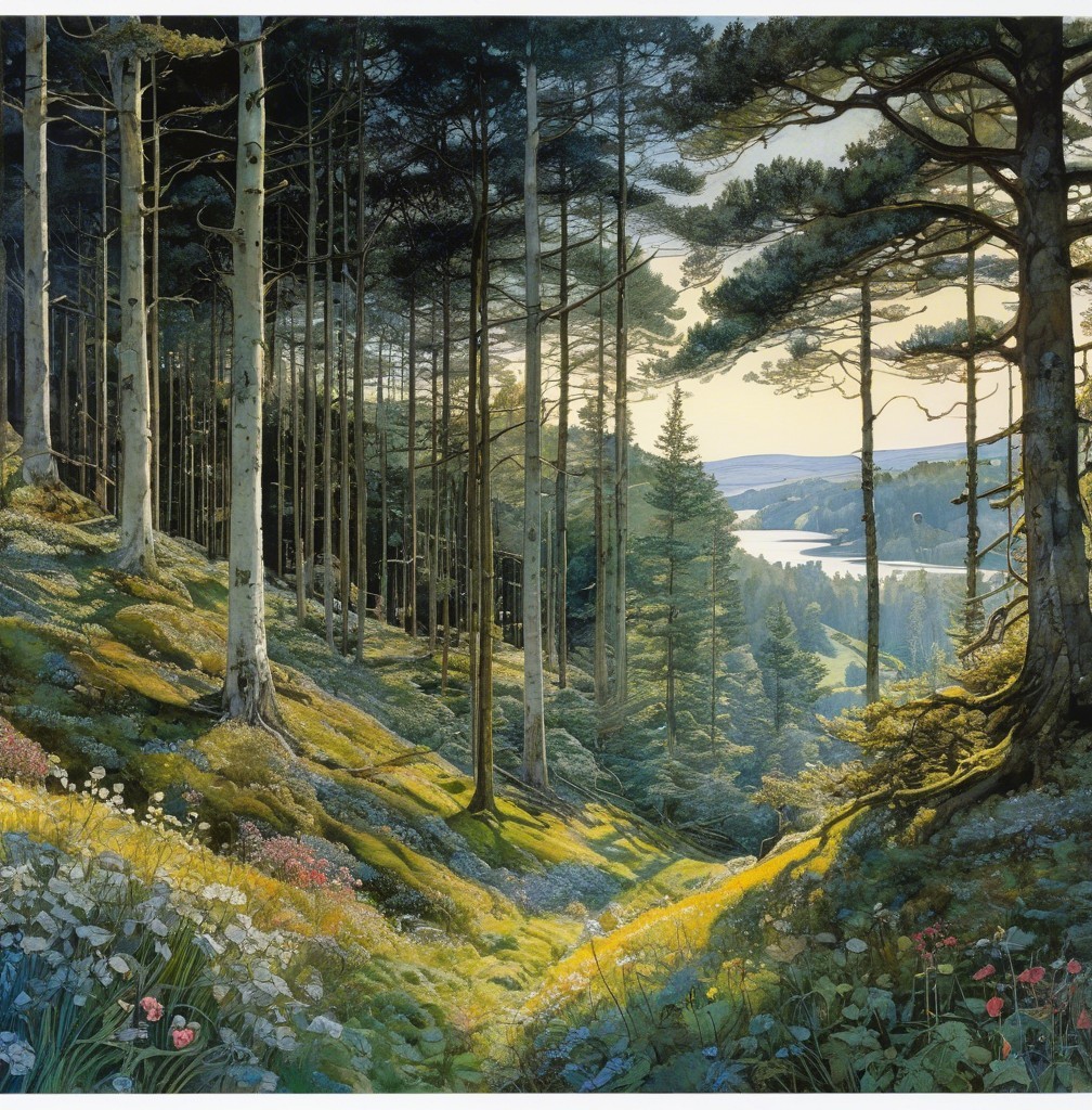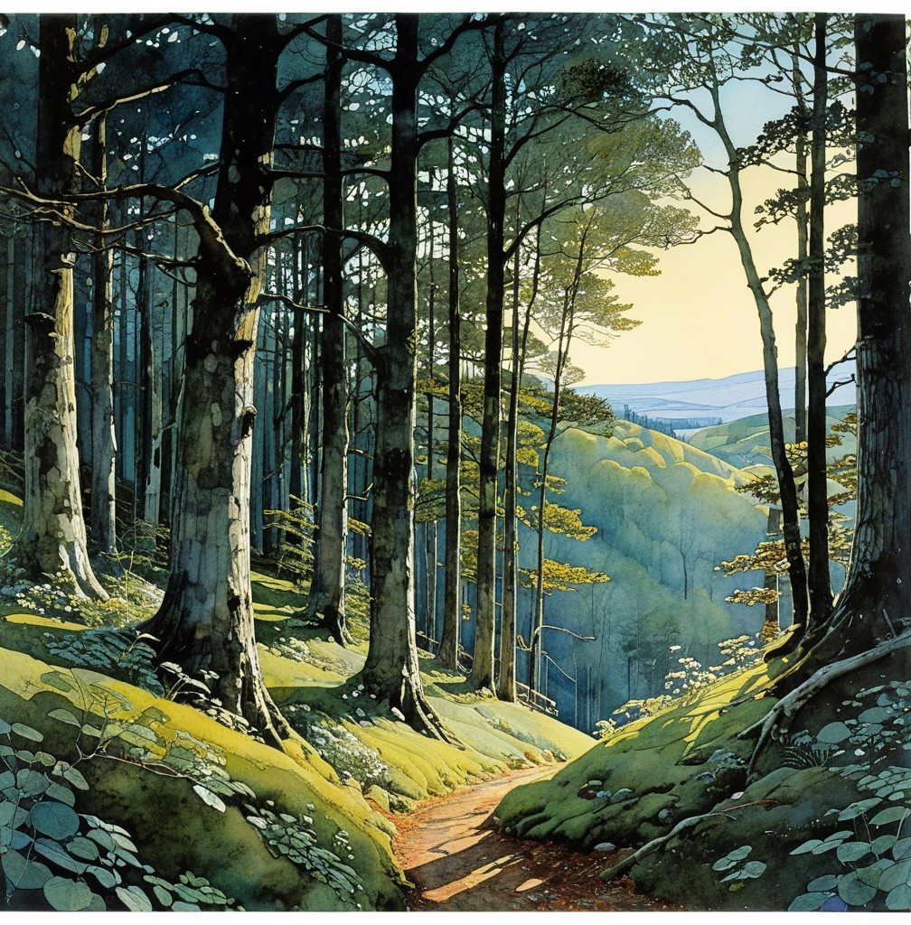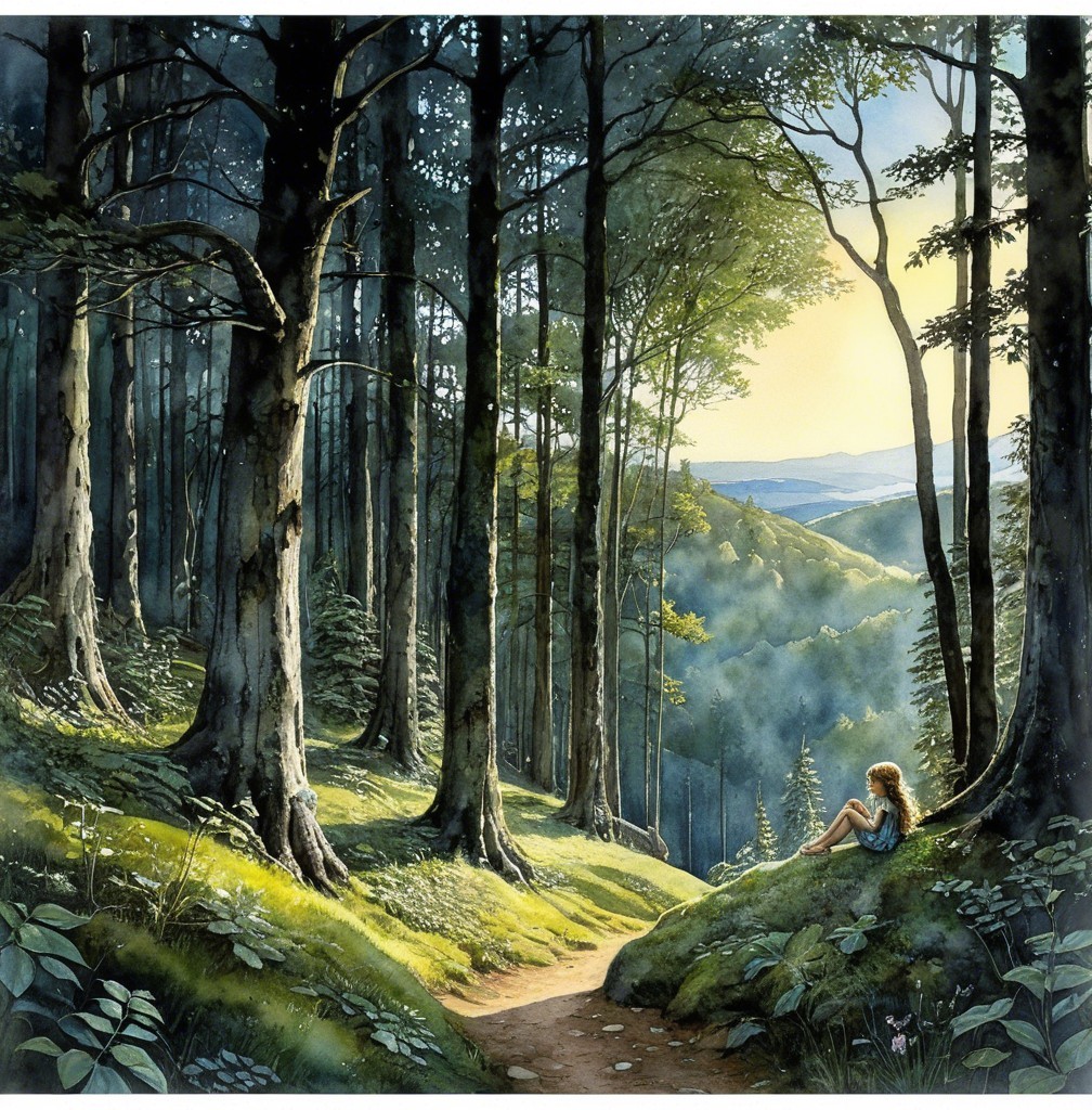 A whimsical scene depicts a young fairy with delicate wings, standing in a lush forest. Sunlight filters through the trees, illuminating a winding path that leads into a serene landscape.